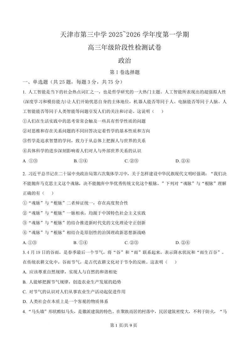 天津市第三中学2026届高三上学期10月月考 政治.docx