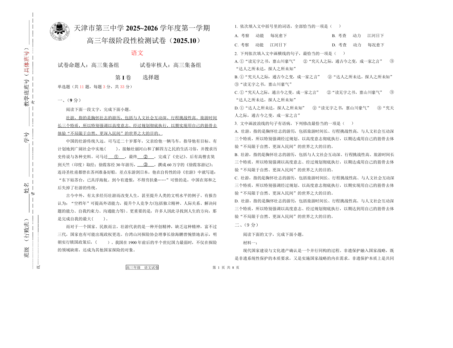 天津市第三中学2026届高三上学期10月月考 语文.docx