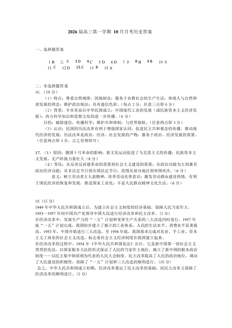 天津市第三中学2026届高三上学期10月月考 历史答案.docx