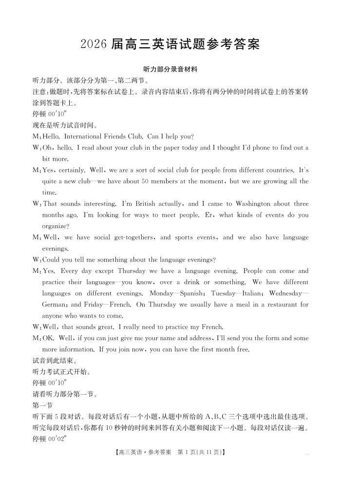 四川省2026届高三上学期10月联考 英语答案.pdf