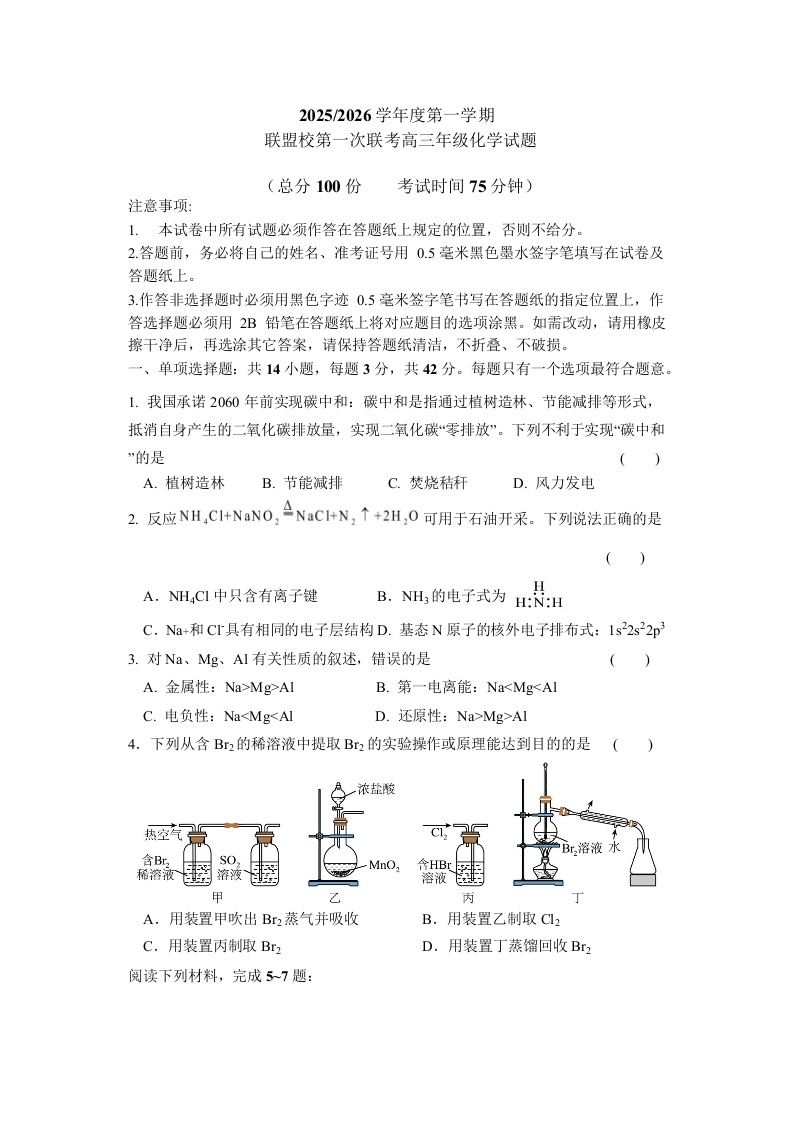 江苏省盐城市五校联考2026届高三上学期10月月考 化学.docx
