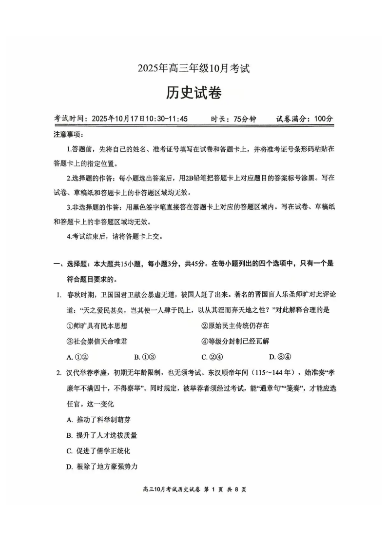 湖北省云学联盟2025年高三年级10月考试 历史试题(含答案).pdf
