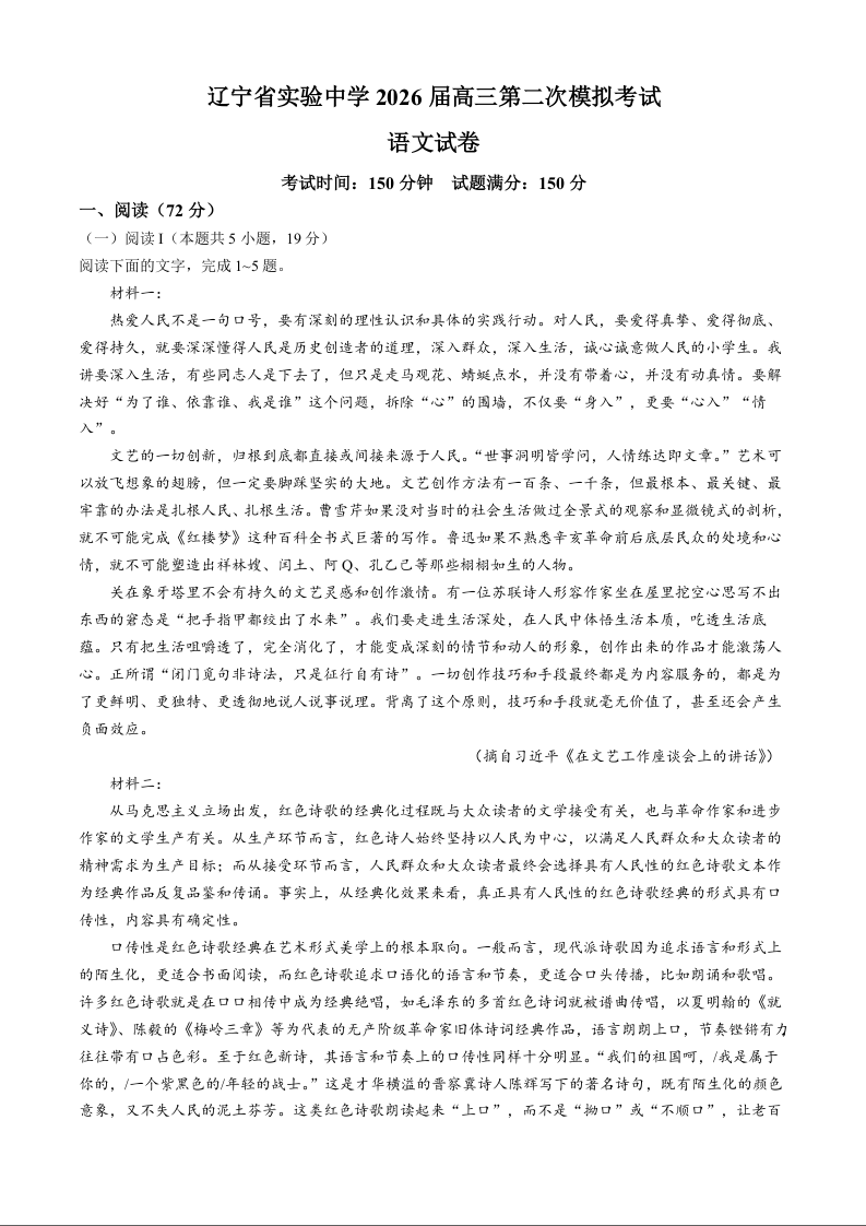 辽宁省实验中学2026届高三第二次模拟考试 语文试题(含答案).docx