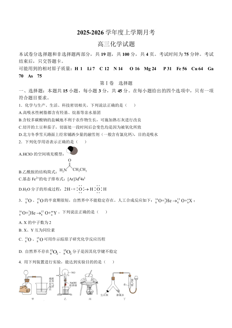 吉林省长春市第二实验中学2026届高三上学期10月月考 化学试题(含答案).docx