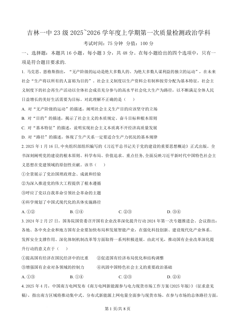 吉林省吉林市第一中学2026届高三上学期第一次质量检测 政治.docx
