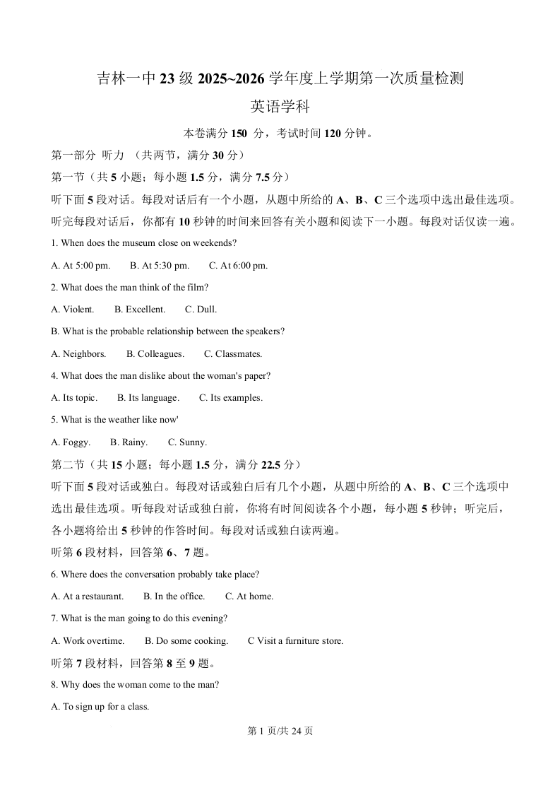 吉林省吉林市第一中学2026届高三上学期第一次质量检测 英语答案.docx