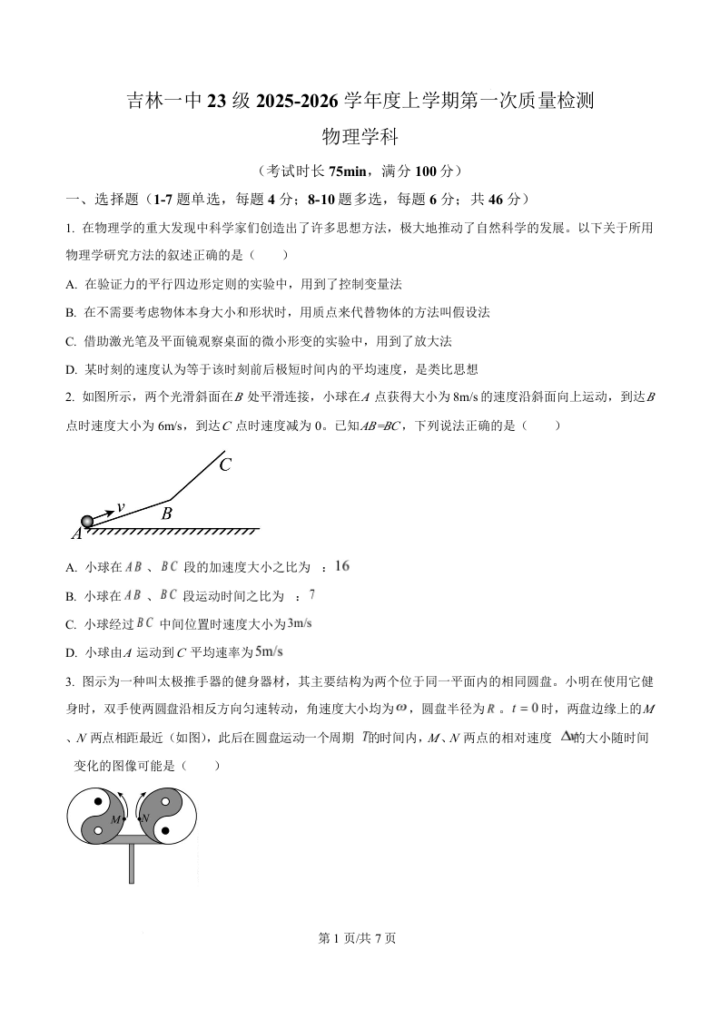 吉林省吉林市第一中学2026届高三上学期第一次质量检测 物理.docx