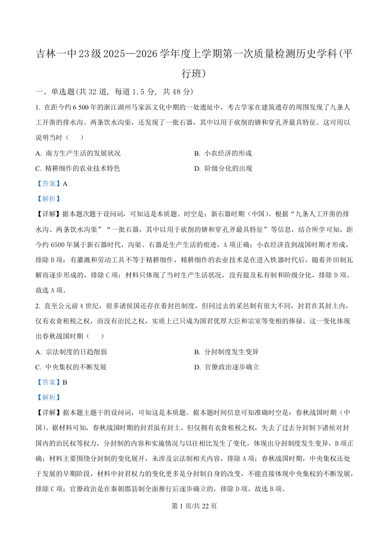 吉林省吉林市第一中学2026届高三上学期第一次质量检测 历史答案.docx