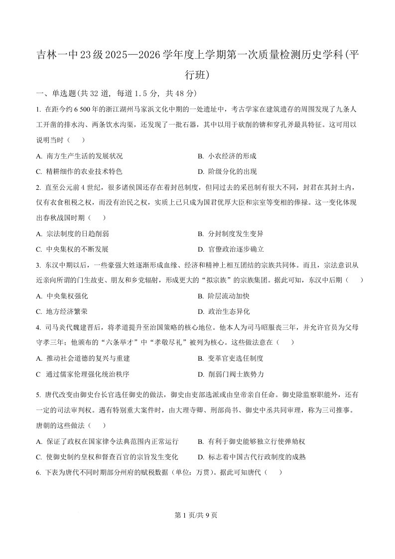吉林省吉林市第一中学2026届高三上学期第一次质量检测 历史.docx