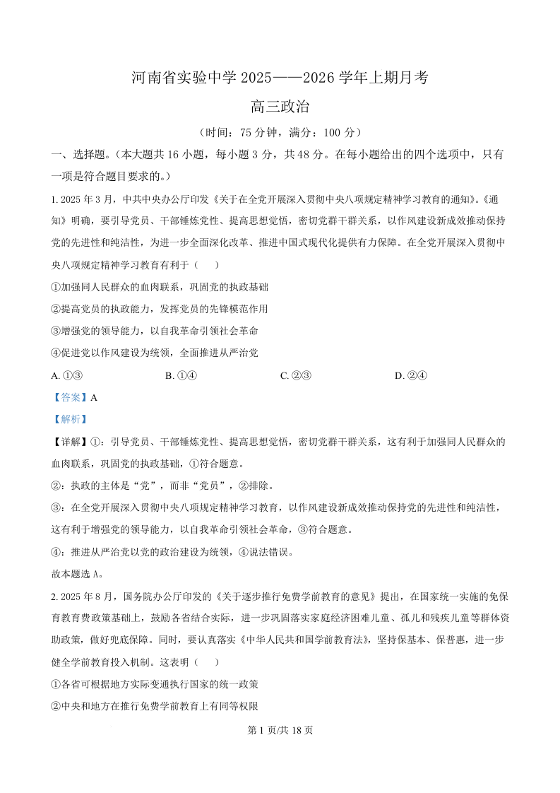 河南省实验中学2026届高三上学期第一次月考 政治答案.docx