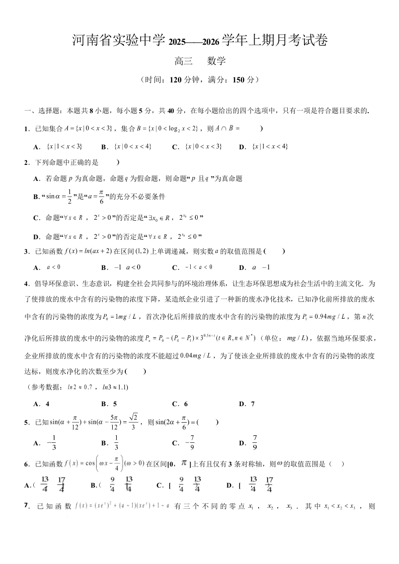 河南省实验中学2026届高三上学期第一次月考 数学.docx