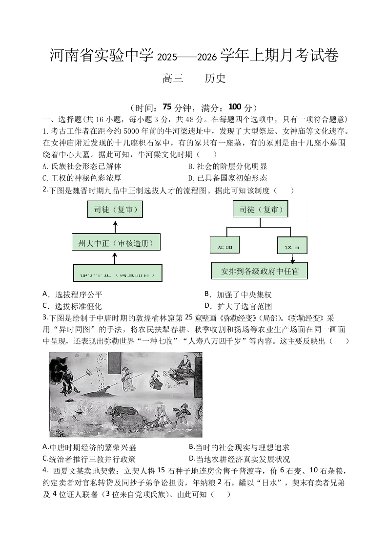 河南省实验中学2026届高三上学期第一次月考 历史.docx