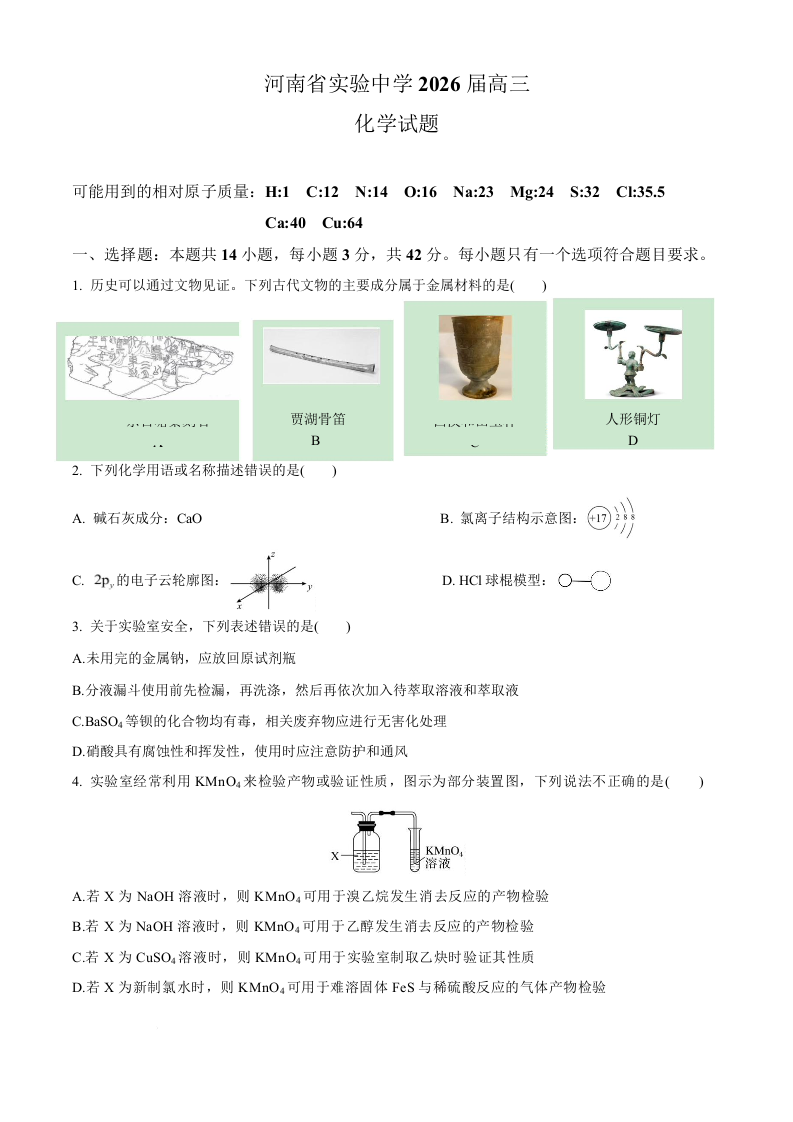 河南省实验中学2026届高三上学期第一次月考 化学试题(含答案).docx