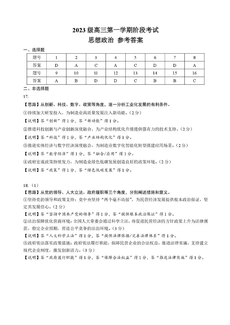 汕头市金山中学2023级高三第一学期阶段考试 政治答案.pdf