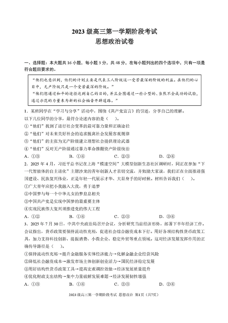 汕头市金山中学2023级高三第一学期阶段考试 政治.pdf