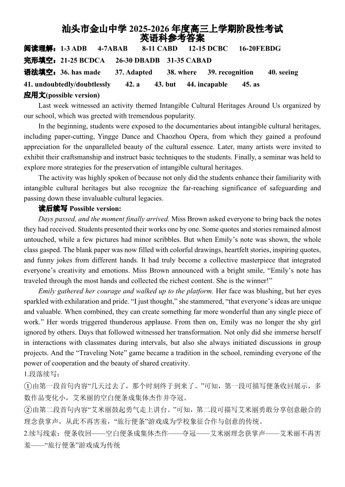 汕头市金山中学2023级高三第一学期阶段考试 英语答案.pdf