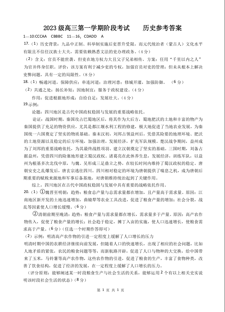 汕头市金山中学2023级高三第一学期阶段考试 历史答案.docx