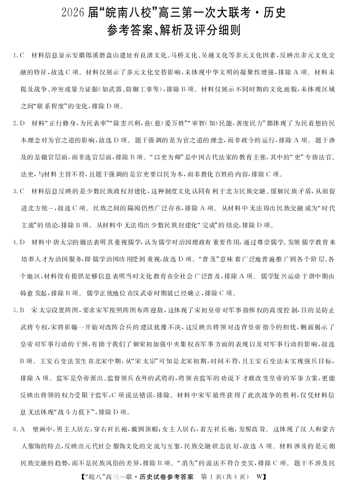 2026届皖南八校高三第一次大联考 历史答案.pdf