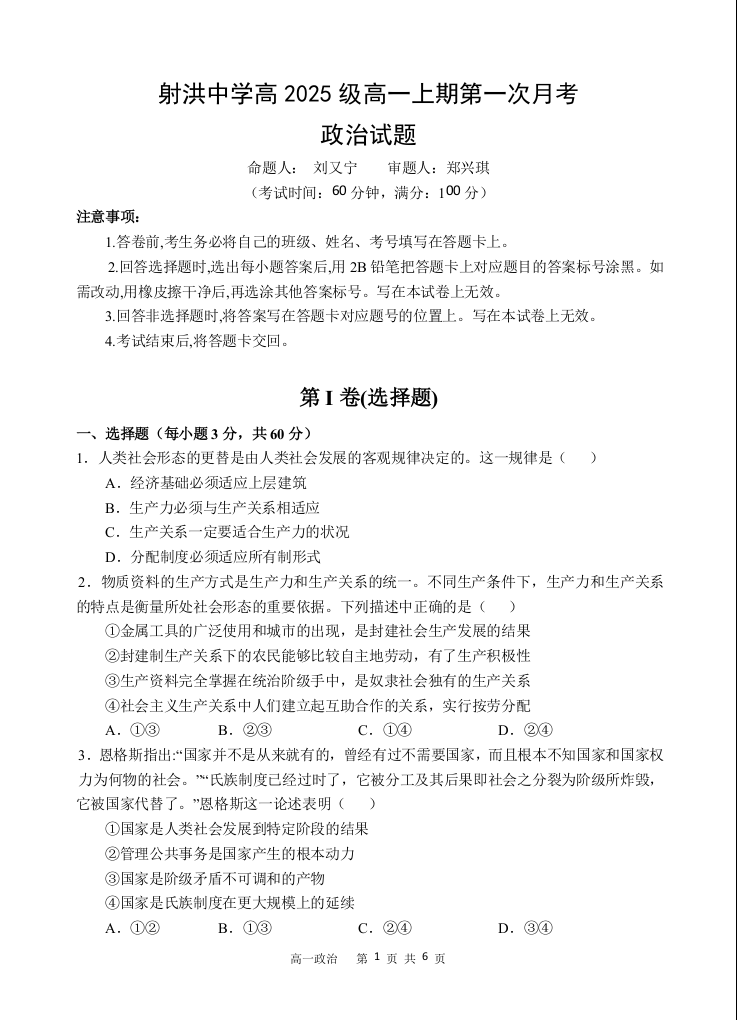射洪中学高2025级高一上期第一次月考 政治.docx