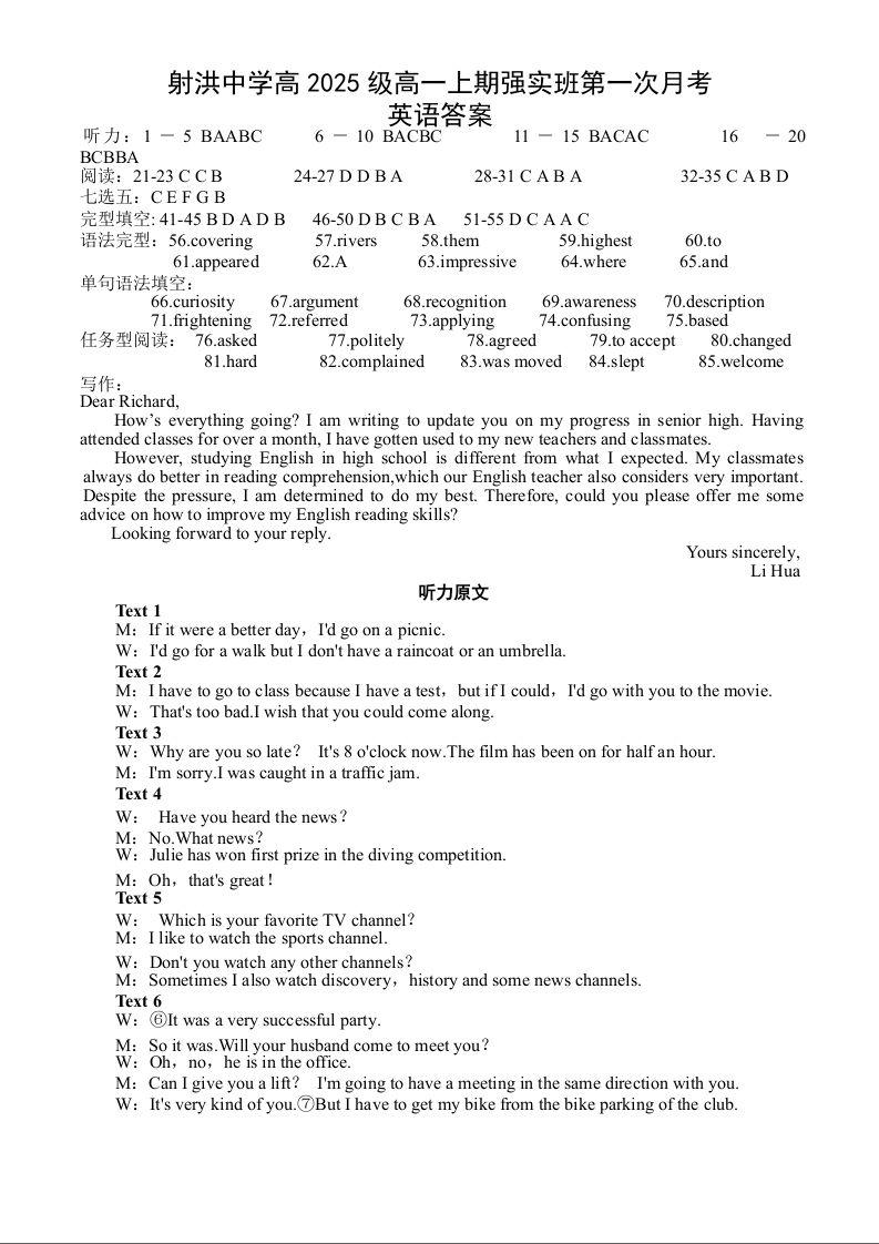 射洪中学高2025级高一上期第一次月考 英语答案.docx