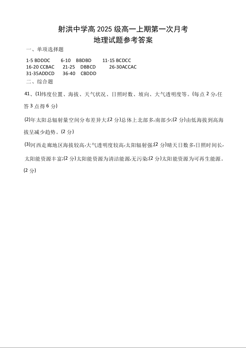 射洪中学高2025级高一上期第一次月考 地理答案.docx