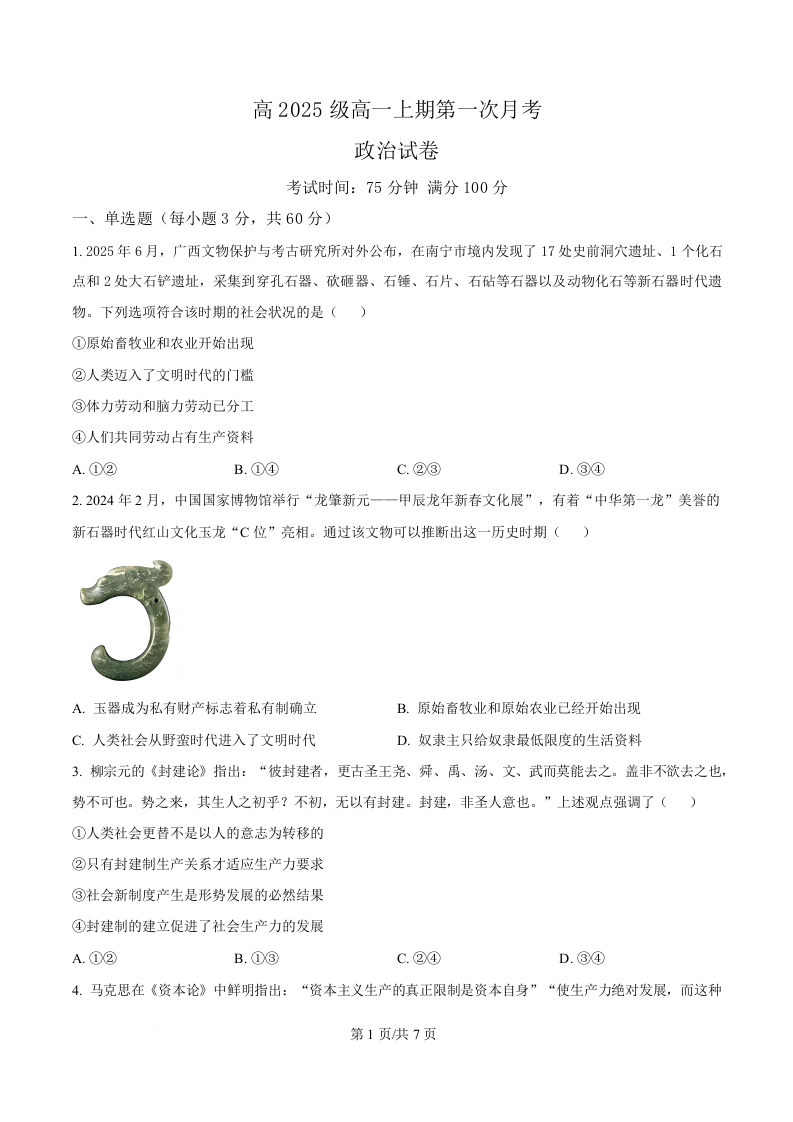 四川省南充市嘉陵第一中学2025-2026学年高一上学期第一次月考 政治.docx
