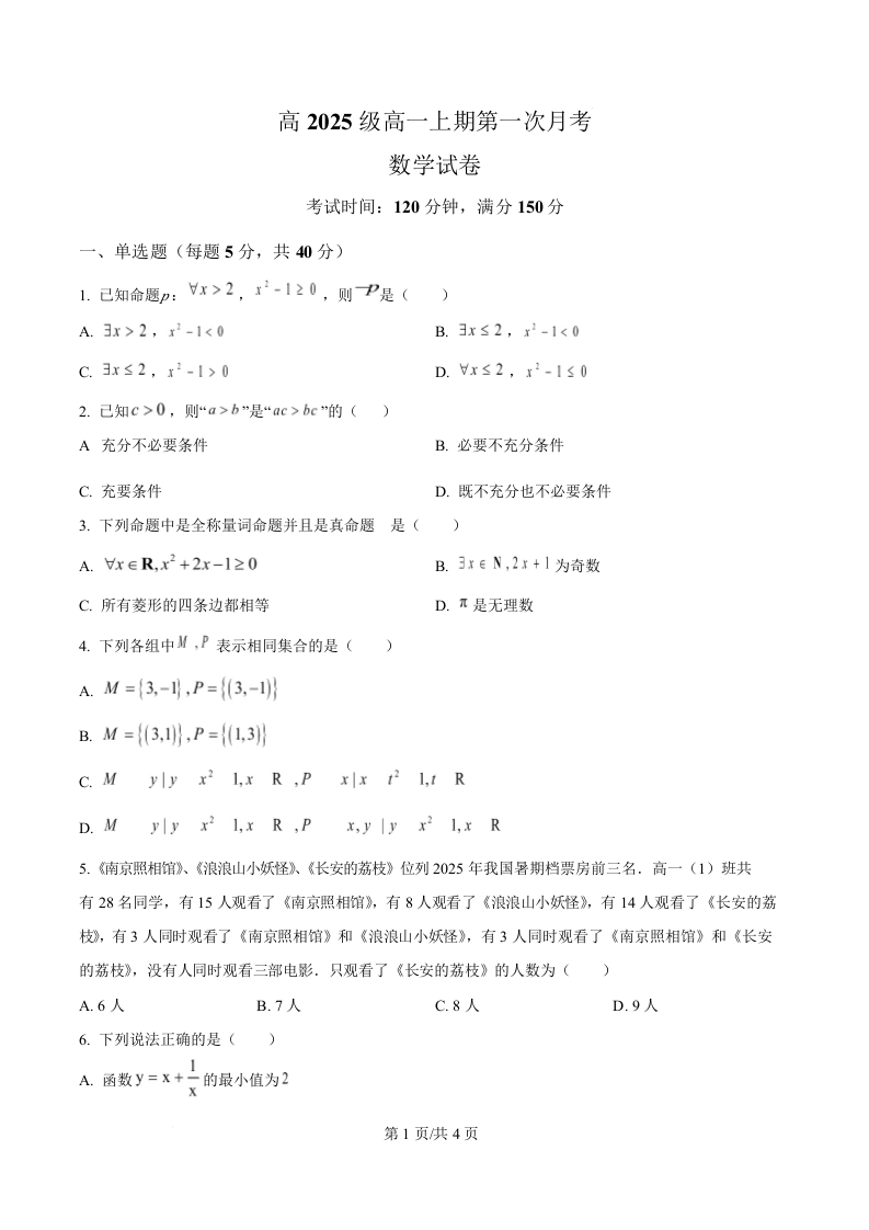 四川省南充市嘉陵第一中学2025-2026学年高一上学期第一次月考 数学.docx