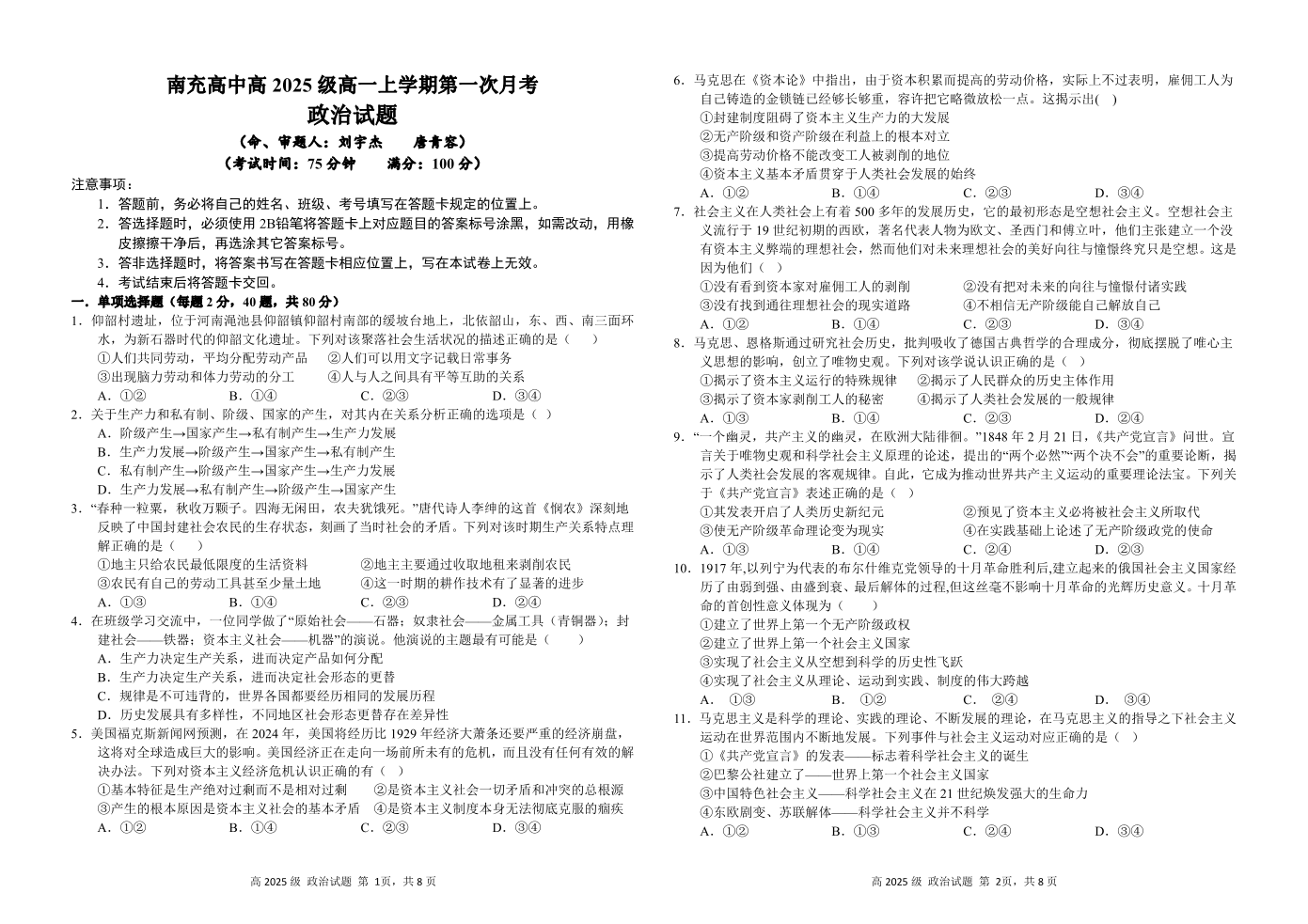 南充高中高2025级高一(上)第一次月考 政治.pdf