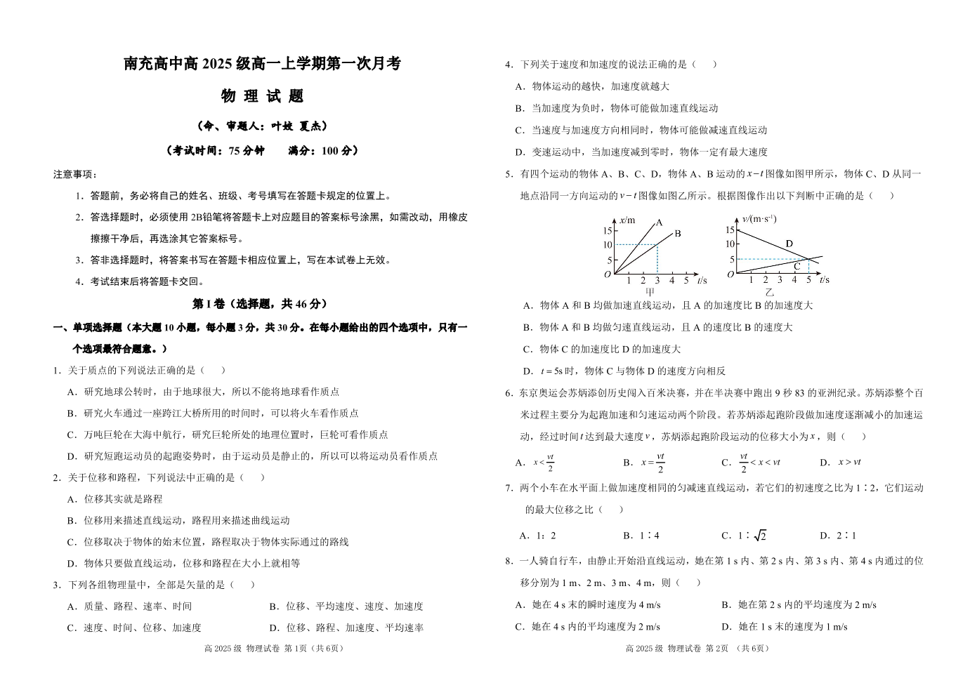 南充高中高2025级高一(上)第一次月考 物理.pdf