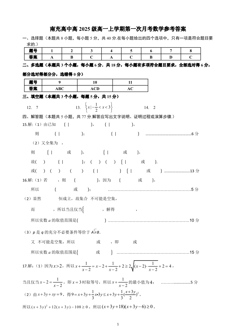 南充高中高2025级高一(上)第一次月考 数学答案.pdf