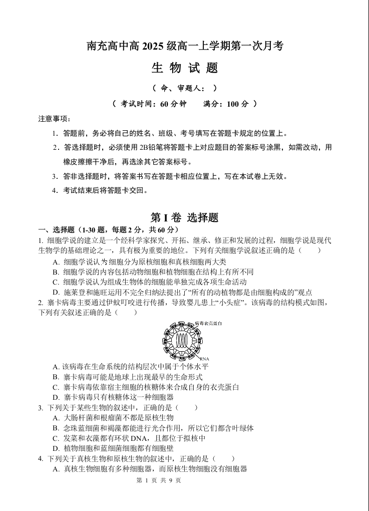 南充高中高2025级高一(上)第一次月考 生物.docx
