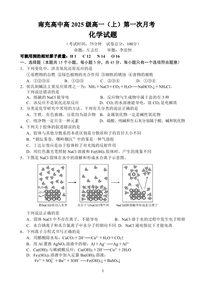 南充高中高2025级高一(上)第一次月考 化学.pdf