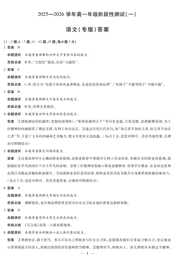 陕西省天一大联考2025-2026学年高一年级阶段性测试(一)语文答案.pdf