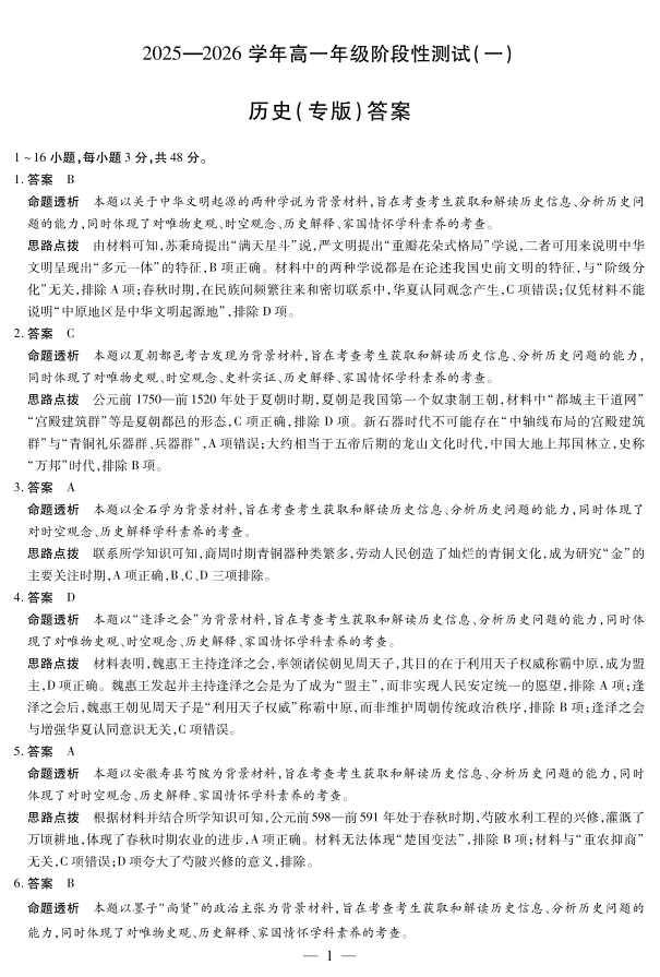 陕西省天一大联考2025-2026学年高一年级阶段性测试(一)历史答案.pdf