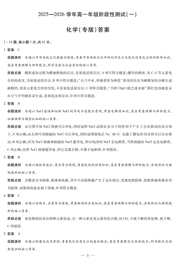 陕西省天一大联考2025-2026学年高一年级阶段性测试(一)化学答案.pdf