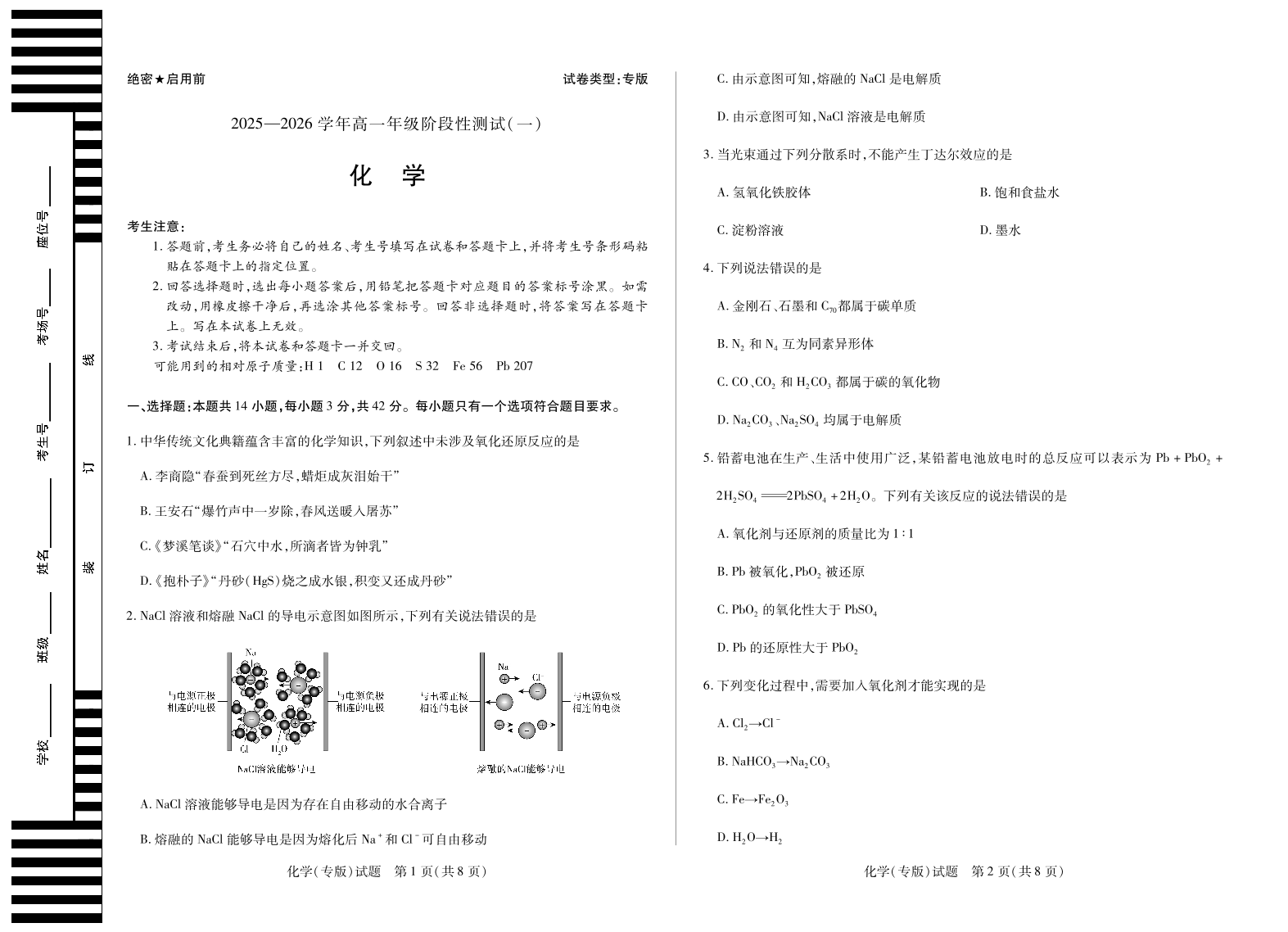 陕西省天一大联考2025-2026学年高一年级阶段性测试(一)化学.pdf
