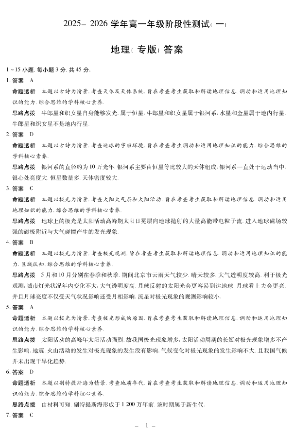 陕西省天一大联考2025-2026学年高一年级阶段性测试(一)地理答案.pdf