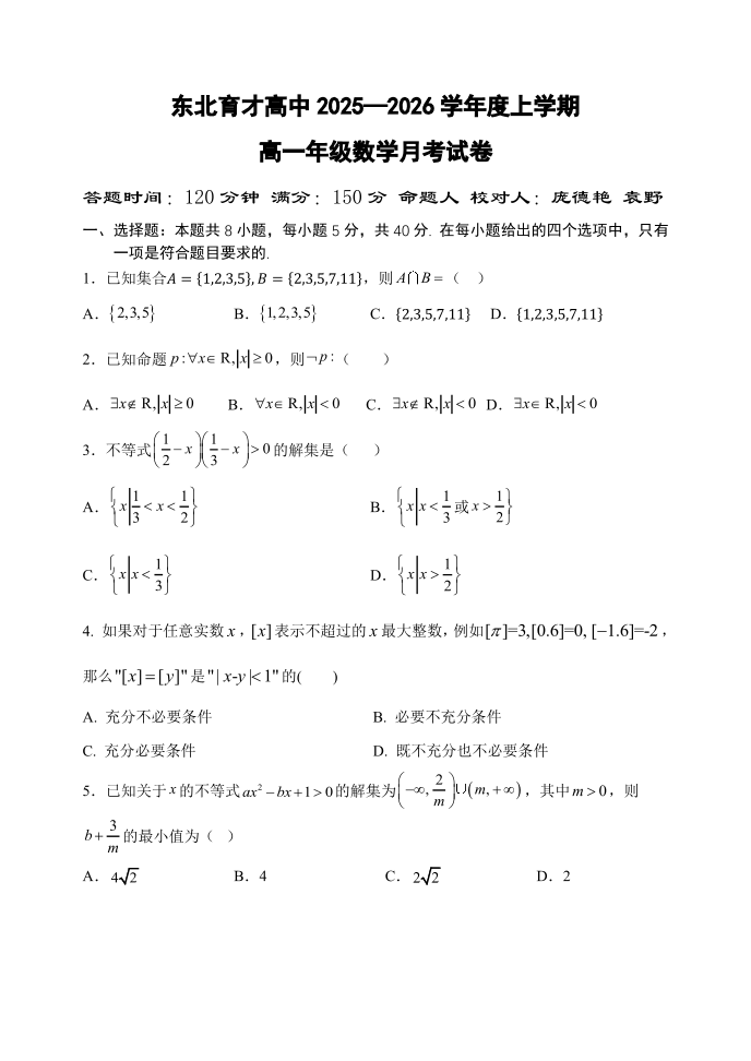 东北育才高中2025--2026学年度上学期高一第一次月考 数学试题(含答案).pdf
