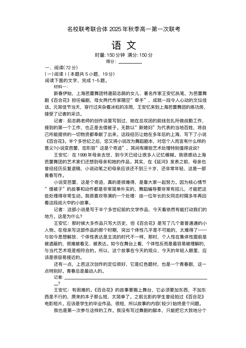 湖南名校联考联合体2025年秋季高一第一次联考 语文试题(含答案).pdf
