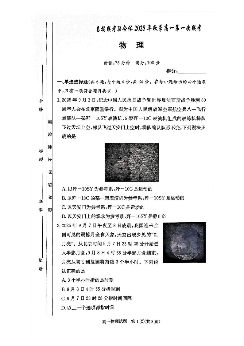 湖南名校联考联合体2025年秋季高一第一次联考 物理.pdf