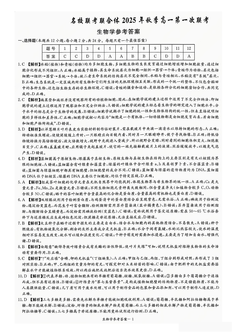 湖南名校联考联合体2025年秋季高一第一次联考 生物答案.pdf