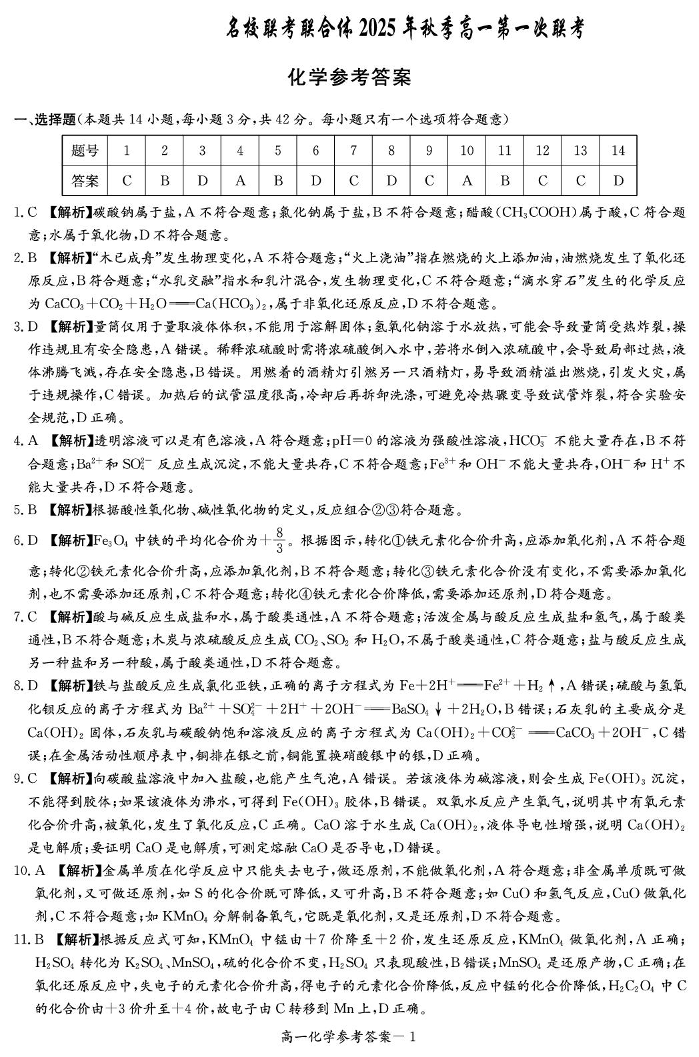 湖南名校联考联合体2025年秋季高一第一次联考 化学答案.pdf