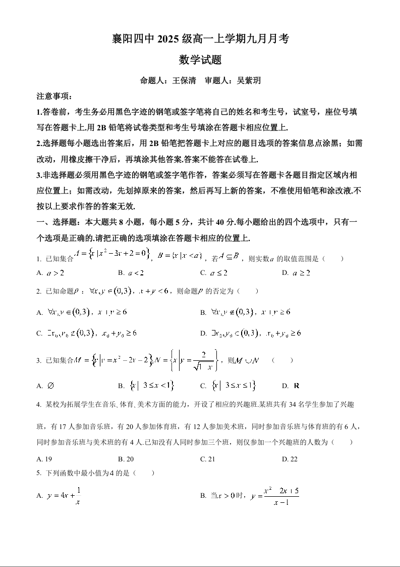 湖北省襄阳市第四中学2025-2026学年高一上学期9月月考 数学.docx