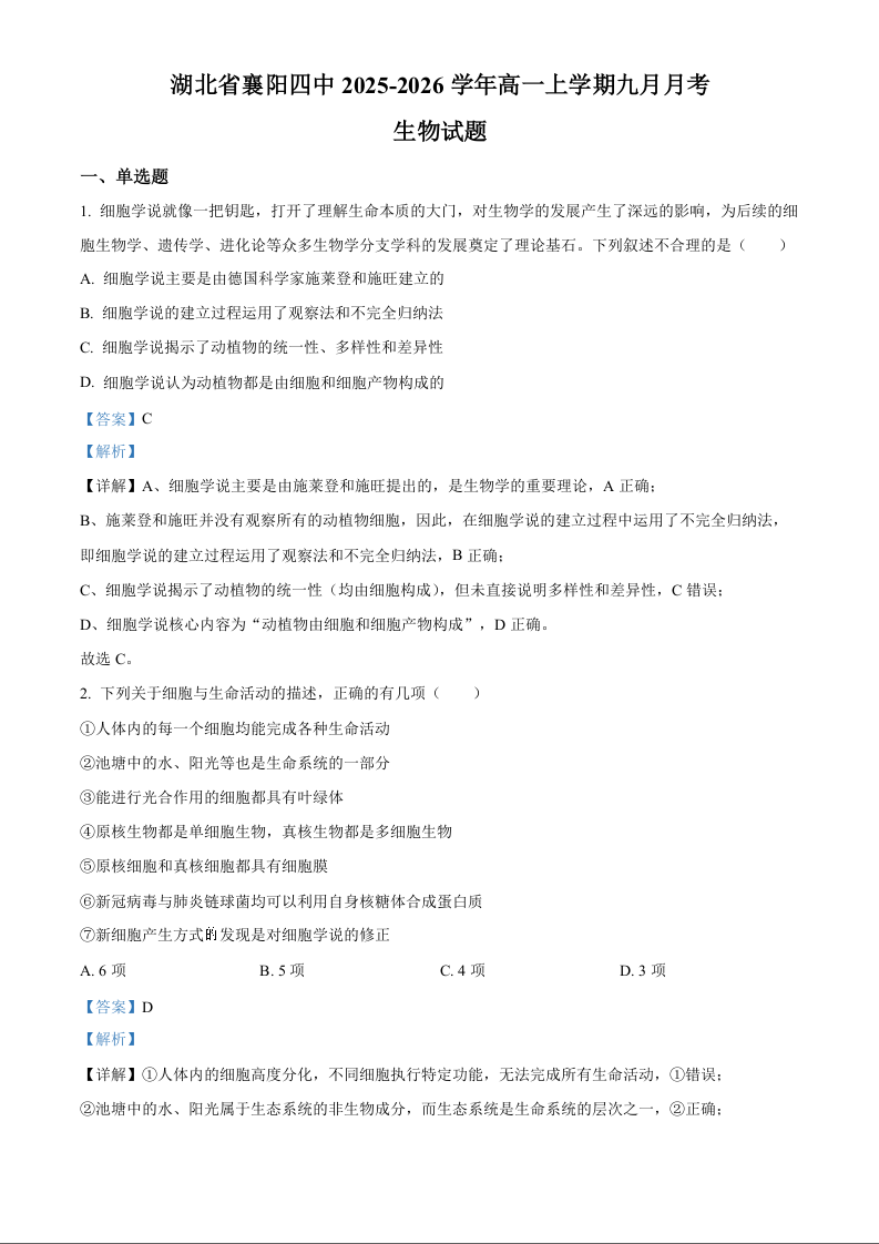湖北省襄阳市第四中学2025-2026学年高一上学期9月月考 生物答案.docx