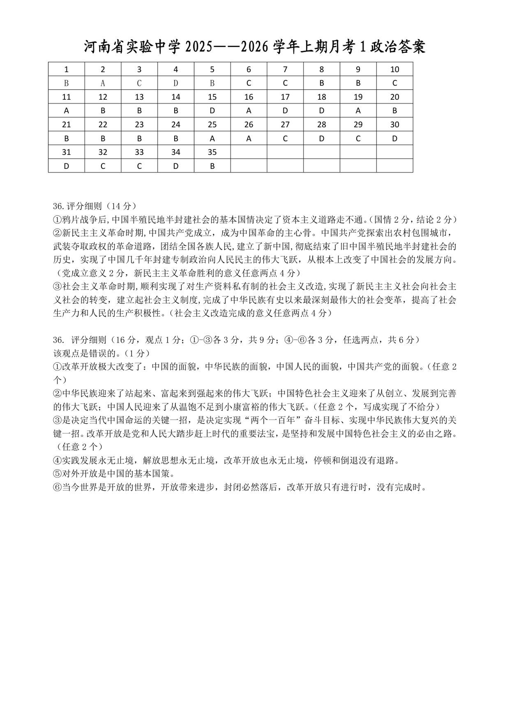 河南省实验中学2025-2026学年高一上学期第一次月考 政治答案.pdf