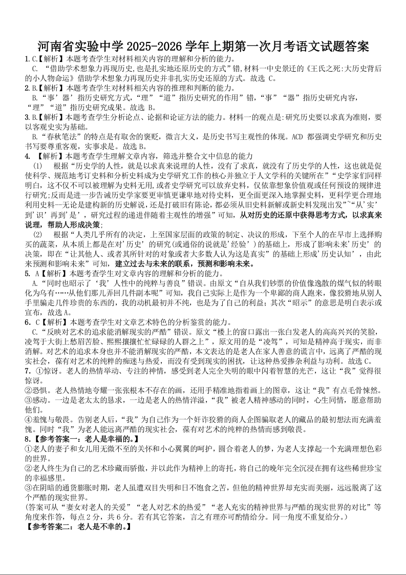 河南省实验中学2025-2026学年高一上学期第一次月考 语文答案.docx