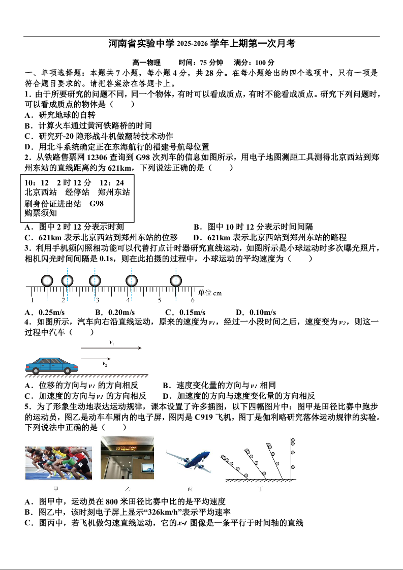 河南省实验中学2025-2026学年高一上学期第一次月考 物理.docx