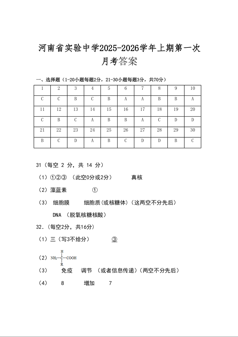 河南省实验中学2025-2026学年高一上学期第一次月考 生物答案.docx
