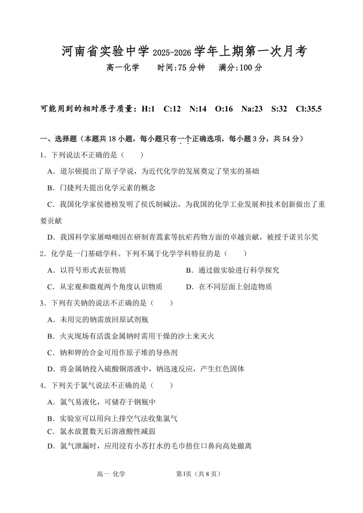 河南省实验中学2025-2026学年高一上学期第一次月考 化学.pdf