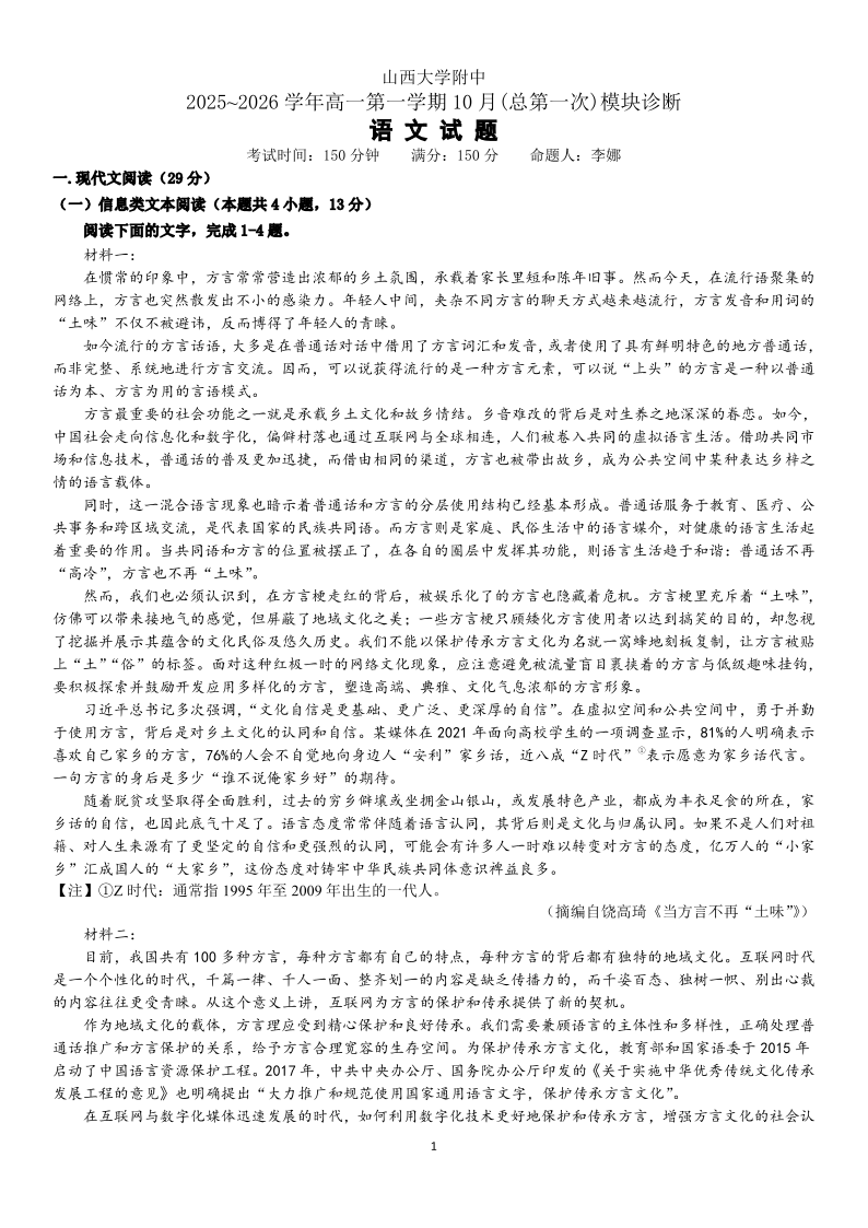 山大附中2025-2026学年第一学期高一年级10月模块诊断 语文答案.pdf